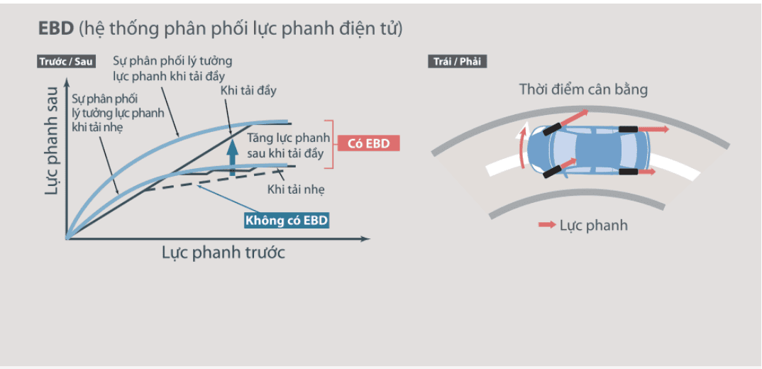 Hệ thống phân phối lực phanh điện tử EBD phân bổ lực phanh hợp lý lên các bánh xe, giúp nâng cao hiệu quả phanh, đặc biệt khi xe đang chất tải và vào cua.