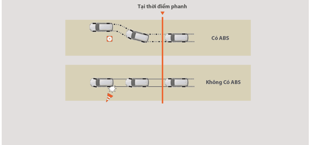 Khi được kích hoạt bằng cách đạp phanh dứt khoát, hệ thống chống bó cứng phanh ABS sẽ tự động nhấp nhả phanh liên tục, giúp các bánh xe không bị bó cứng, cho phép người lái duy trì khả năng điều khiển xe tránh chướng ngại vật và đảm bảo ổn định thân xe.