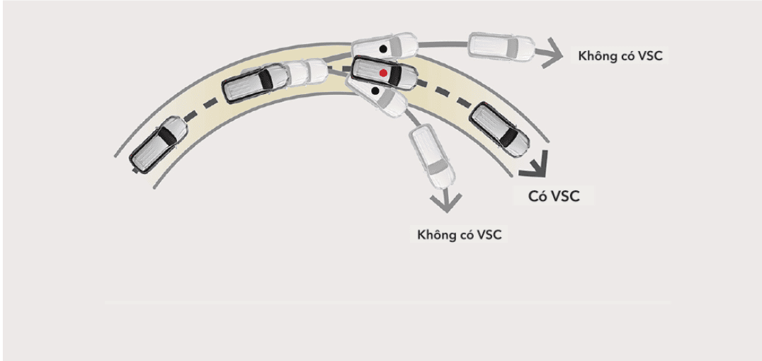 Hệ thống VSC kiểm soát công suất động cơ và phân bổ lực phanh hợp lý tới từng bánh xe, nhờ đó giảm thiểu nguy cơ mất lái và trượt bánh xe đặc biệt trên các cung đường trơn trượt hay khi vào cua gấp.